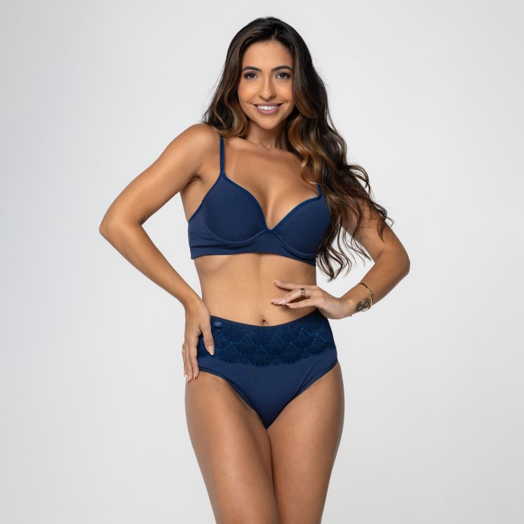 Esta calcinha na elegante cor marinho destaca-se pelo delicado detalhe em renda na cintura, que adiciona um toque de sofisticação ao design. Vale ressaltar que, em produtos com renda, os desenhos podem variar, tornando cada peça única e especial. O modelo oferece cobertura ideal e ajuste perfeito ao corpo, proporcionando conforto e bem-estar ao longo do dia.