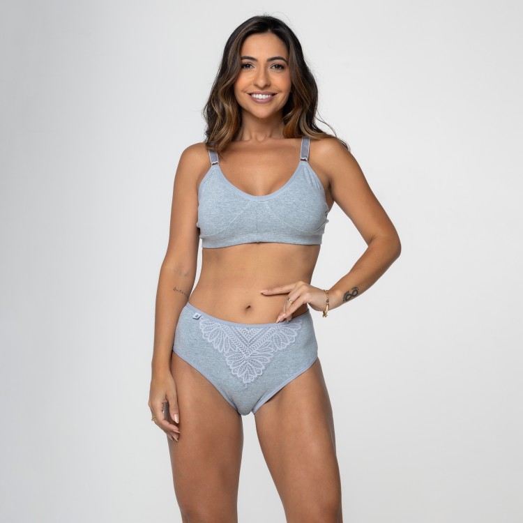 Calcinha de cintura alta na cor cinza com detalhe em renda