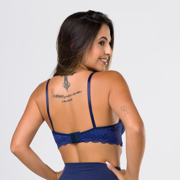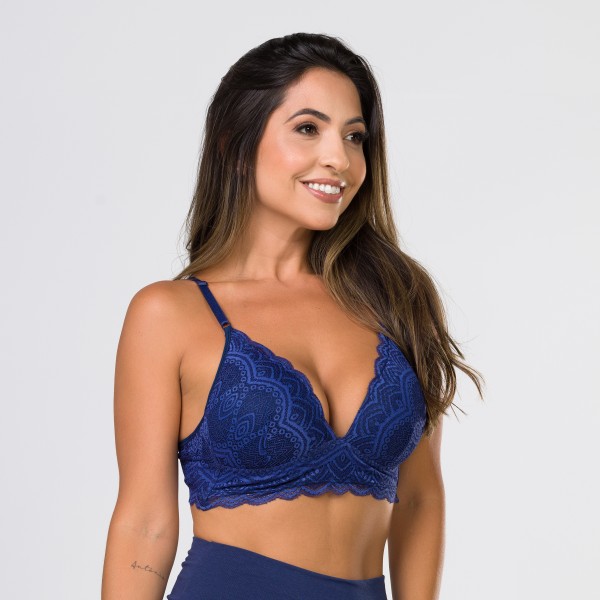 Sutiã com Bojo Flexível Sem Aro em Algodão Egípcio e Renda Azul na cor marinho