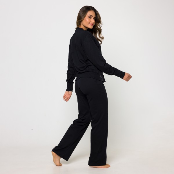 Pijama Longo em Algodão e Poliéster. Composto por duas peças, o modelo é ideal para boas noites de sono. A blusa apresenta decote em "V" com botões para fechamento, mangas longas. Já a calça, em modelagem básica, possui elástico e fita para amarrar. Acompanha linda necessaire.
